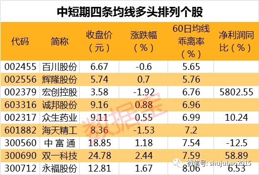 在5日、10日、20日、60日四条近日形成多头排列的个股当中,14只2019年中期业绩净利润同比增幅超过五成,宏创控股、智动力、北京君正等个股业绩增幅最大,分别为5802%、1785%、211%。