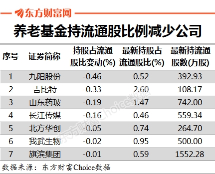 相反,有7家公司养老基金持有流通股比例减少,其中九阳股份减少最多,为0.46%,最新持股为392.93万股。此外,吉比特、山东药玻和长江传媒,养老基金持流通股比例减少也超过0.1%。