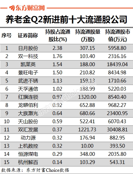 当然,也有15家公司是养老基金二季度新进前十大流通股公司,其中日月股份最新持股占流通股比例最高,为2.38%,持仓市值为5958.8万元。此外,像双一科技、凯莱英、景旺电子、武进不锈和天孚通信等公司,养老基金最新持股占流通股比也均超过1%。