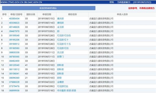 8月27日,中新经纬客户端查询中国商标网发现,目前郎酒的商标所有权仍由古蔺县久盛投资有限公司(以下简称“久盛投资”)持有。中新经纬客户端注意到,截至2019年8月25日,久盛投资共申请了580件商标,包含“郎酒”“红花郎”“青花郎”等。