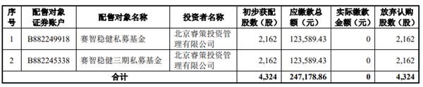 9月2日晚间,安博通披露的科创板上市发行结果显示,网下投资者弃购了4324股,弃购金额24.59万元,弃购对象为赛智稳健私募基金、赛智稳健三期私募基金,弃购数量皆为2162股,投资者为北京睿策投资管理有限公司。