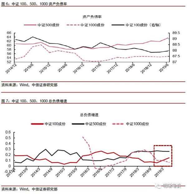 从非金融上市企业的规模这一视角看,企业存在“融资资质分化”。上文中的现象拥有一个直观解释:各行业绩优龙头股的经营绩效明显好于其他企业,大盘的上市企业往往是经营良好、实力强劲的行业细分龙头,而其他中小规模上市企业与各大龙头相比经营和资质便有所逊色。具体来看,自2019年来中证100、500、1000指数的财务数据中,仅有中证100、500延续资产负债率上升的态势;2019年第2季度,大盘股中证100的资产负债率已达86.96%;而中证1000的资产负债率仅为54.6%,与去年年末持平。从各指数公司的平均总负债增速来看,中证500所含公司总负债增速即有走平趋势,而中证1000指数所含公司总负债增速自2018年下半年即有下滑态势。这说明,融资分化在上市公司内部早已存在,大、中盘股融资情况显著优于小盘股。
