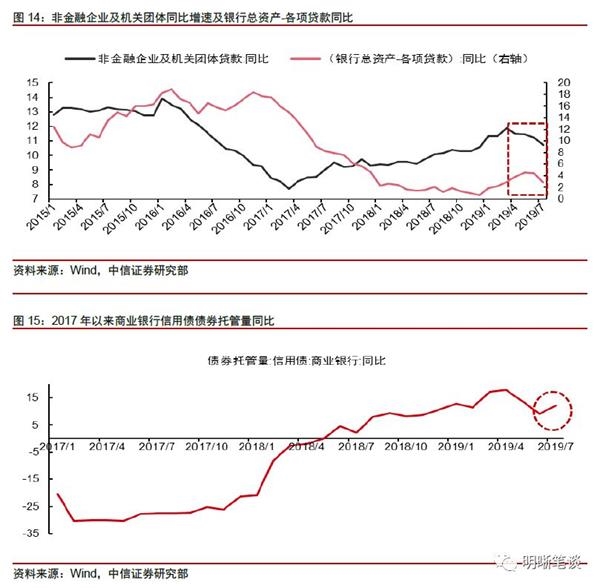 从银行端看:监管严格+债市火热是两个因素。严监管带来的非标融资下滑和企业债券性价比提高是企业信贷不足的两个影响因素。由于企业部门仅有少数龙头企业经营绩效较好,多数企业的资质下沉就是银行难以放贷的一大因素。而信贷融资之外,金融严监管背景下,表外融资、非标融资承压,宽信用又显得不那么通畅。我们认为短期内非标融资难以反弹。银行部门非信贷资产增速目前已经掉头向下,而2季度该项增速稍好时,表内信贷表现却不佳,使得企业融资总体表现低迷。若信贷持续不振,预计表外融资很难支持企业信贷投放。同时银行在债市走牛的大背景下,也开始更多的配置企业债券,这种“债-贷”的性价比变化同样为企业信贷带来了压力。