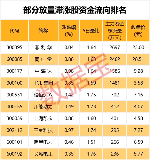 最新数据显示,两市共有44只A股放量滞涨,其中华灿光电、法尔胜、金发拉比等个股5日量比最大,分别达4.52、3.98、3.4。值得注意的是,44只放量滞涨股中,菲利华、同仁堂、中海达、TCL集团等个股主力资金净流入最多。