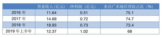 由于备受华南地区食客的认可,九毛九国际利润逐年增长。2016年、2017年、2018年和2019年上半年,九毛九国际的营业收入分别为11.64亿元、14.69亿元、18.93亿元和12.37亿元,相应的净利润分别为0.51亿元、0.72亿元、0.73亿元和1.02亿元。其中,仅广东地区就为九毛九国际贡献了七成左右的收入。相应报告期内,九毛九国际自广东地区取得收入的比例为75.1%、74.7%、73.4%及68%。