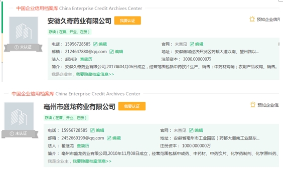 不仅如此,根据公开信息显示,“亳州市盛龙药业有限公司”的法人代表为翟继龙,此人还是“亳州市昌祥药业有限责任公司”的法人代表,这家公司已经清算注销;“亳州市昌祥药业有限责任公司”持股40%的股东为赵洪玲,而赵洪玲是三力制药的参股公司“安徽久奇药业有限公司”的第一大股东及法人代表。此外,根据水滴信用公示的信息,“亳州市盛龙药业有限公司”和“安徽久奇药业有限公司”的联系电话完全一致,均为15956728585。