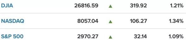 昨夜美股盘中,受中美贸易利好消息提振投资者的信心,三大股指收涨,其中道琼斯工业平均指数盘中一度上涨超500点。截至北京时间10月12日04:00收盘,道琼斯工业平均指数涨1.21%,报26816.59点;纳斯达克综合指数涨1.34%,报8057.04点;标普500指数涨1.09%,报2970.27点。