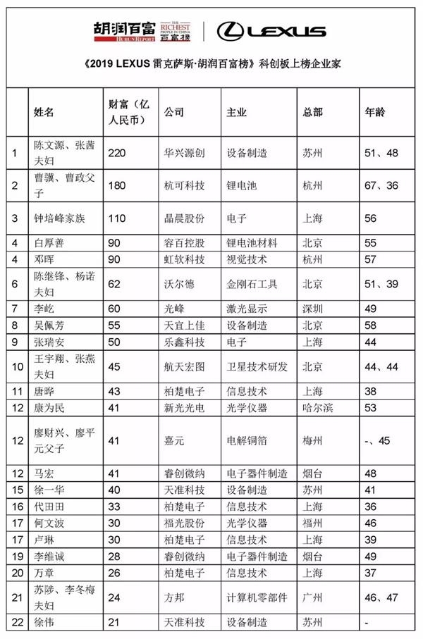 值得一提的是,科创板贡献了22位上榜企业家,平板检测设备商华兴源创的实控人陈文源、张茜夫妇以220亿元身家成为“科创板首富”。