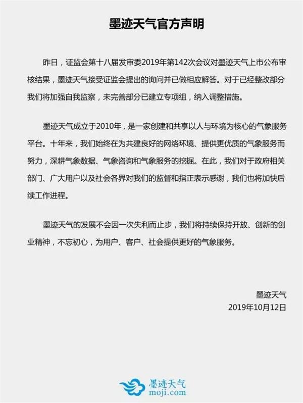 10月12日,墨迹天气官微发布官方声明称,对于发审委提出的问询,公司对已整改部分会加速自我监察,未完善部分已建立专项组,纳入调整措施。