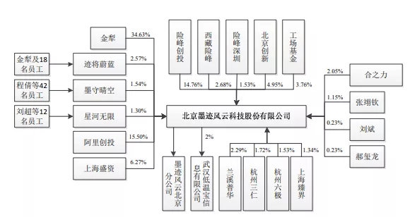 从股权状况来看,除创始人金犁合计控制墨迹科技37.19%股份,墨迹科技持股5%以上股东可算是星光闪耀,包括险峰系(险峰创投、西藏险峰、险峰深圳,合计持股18.97%)、阿里系(阿里创投,持股15.5%)、创新工场系(北京创新、工厂基金,合计持股8.71%)等。