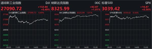 周一美国三大股指集体收高,标普500指数创历史最高收盘纪录。截至收盘,道指涨0.49%报27090.72点,标普500涨0.56%报3039.42点,纳指涨1.01%报8325.99点。