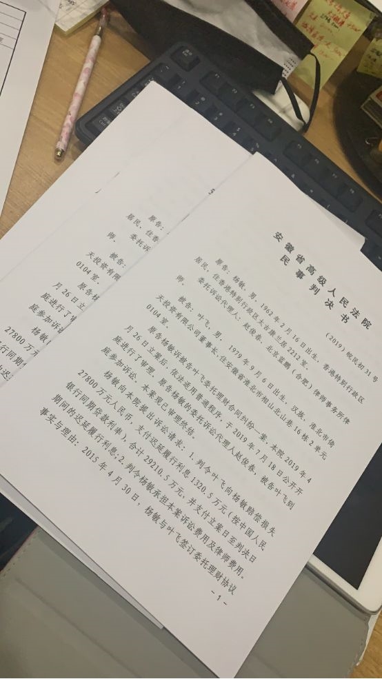 根据记者最新获悉的判决书,经过数月审理,法院做出的判决部分支持杨敏的诉讼请求。在判决生效之日30日内,叶飞赔偿杨敏损失本金2.224亿元。