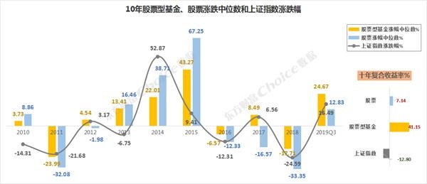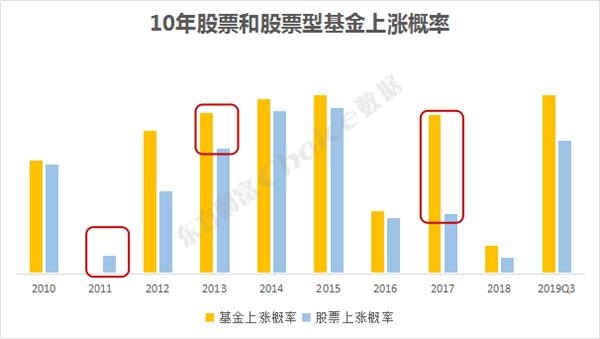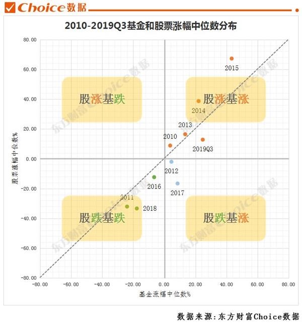 股票涨,基金也涨的年份有2010、2013、2014、2015和2019前三季度,共5次,但是仅有2019Q3基金涨幅中位数高于同期股票涨幅中位数;