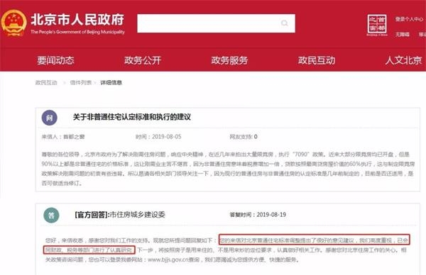 在今年8月19日,北京市住建委就曾公开回复市民关于普通与非普通住宅认定标准建议。北京市住建委称,已会同财政、税务等部门进行了认真研究,下一步,将按照房子是用来住的、不是用来炒的的定位要求,认真做好相关工作。中新经纬还在上海、广州等城市相关政府网站看到,有市民也对该政策进行了咨询或建议,但未能查询到政府部门的公开回复。