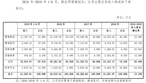 打印设备及相关智能软件为核心业务,2016 年-2019 年 16 月内收入占比 88.97%;提供 3D 打印服务为战略培育业务,2016 年-2019
