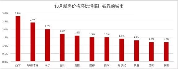 从环比涨幅来看,西宁以2.8%的涨幅领跑,呼和浩特紧随其后,涨2.4%。排名前十的城市分别为西宁、呼和浩特、南宁、唐山、洛阳、成都、昆明、哈尔滨、长春,沈阳和襄阳并列第十。