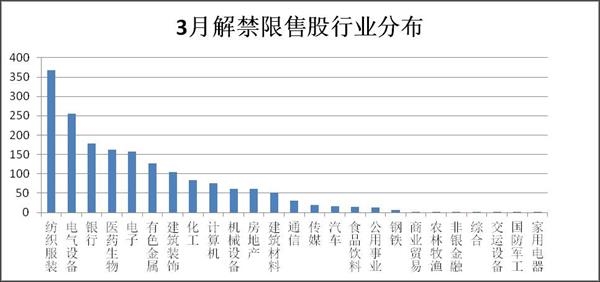 从行业来看,28个申万一级行业板块中有25个板块在3月份存在限售股解禁,纺织服装和电气设备的解禁市值超过200亿元,分别为367.05亿元和255.84亿元。银行、医药生物、电子、有色金属和建筑装饰板块的解禁规模超过100亿元,分别为178.44亿元、162.26亿元、156.89亿元、126.64亿元和104.08亿元。与之相比,非银金融、综合、交运设备、国防军工和家用电器板块的解禁规模较小,均低于1亿元。