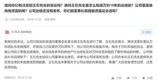 但有批评者称,王石此举是“把信披当儿戏”。对此,万科方面回应称,王石卸任公司董事会主席后,公司未向提供有关经营业绩的未披露数据,王石也未掌握有关公司业绩的内幕信息。其说法仅为个人判断。