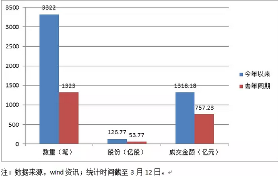 数据显示,截至3月12日,今年以来,两市共计发生3322笔大宗交易,同比暴增151.10%!!!共计成交126.77亿股,同比增加135.76%!!涉及成交金额1318.18亿元,同比增长74.08%!