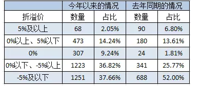 数据显示,今年以来两市大宗交易的平均折溢价率为-3.84%,而去年同期这一数据为-4.61%,平均折价幅度收窄16.70%。今年以来,两市大宗交易中溢价成交的共计541笔,去年同期为270笔,虽然占总数的比例有所下降,但是绝对数值增长可观。