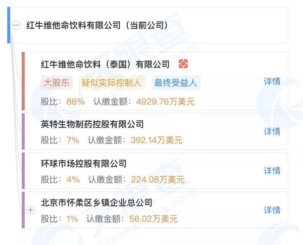 天眼查信息显示,红牛公司的控股股东为红牛维他命饮料(泰国)有限公司(下称“泰红牛公司”),占红牛公司88%的股份。