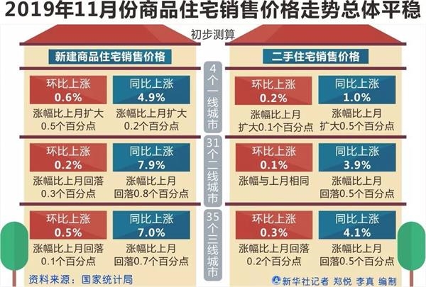 “11月份,各地坚持‘房住不炒’定位,一城一策、因城施策,落实房地产长效管理机制,不将房地产作为短期刺激经济的手段,保障了房地产市场总体稳定。”国家统计局城市司首席统计师孔鹏分析指出,初步测算,4个一线城市新建商品住宅销售价格环比上涨0.6%,涨幅比10月扩大0.5个百分点。其中,北京、上海和深圳分别上涨1.7%、0.3%和0.2%,广州下降0.5%。二手住宅销售价格环比上涨0.2%,涨幅比10月扩大0.1个百分点。其中,北京和广州分别下降0.4%和0.2%,上海持平,深圳上涨1.4%。31个二线城市新建商品住宅销售价格环比上涨0.2%,涨幅比10月回落0.3个百分点;二手住宅销售价格环比上涨0.1%,涨幅与10月相同。35个三线城市新建商品住宅和二手住宅销售价格环比分别上涨0.5%和0.3%,涨幅比10月分别回落0.1和0.2个百分点。