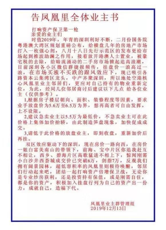 《告业主书》称,2月份国务院粤港澳大湾区规划重磅公布,给横盘几年的房地产市场打入一枚强心剂,8月18日先行示范区的发布更给市场起到推波助澜的作用,接着放开港澳人士置业,被豪宅税的去除,给暗流涌动的二手房市场掀起追高浪潮,目前深圳各小区微信群捷报频传,挂牌价一浪高过一浪,在市场买涨不买跌的跟风效应下,现已吸引各路资本云集湾区龙头,中产齐聚深圳,所以地处空港核心凤凰里业主邻居们,更应对自己持有的物业重新定位。