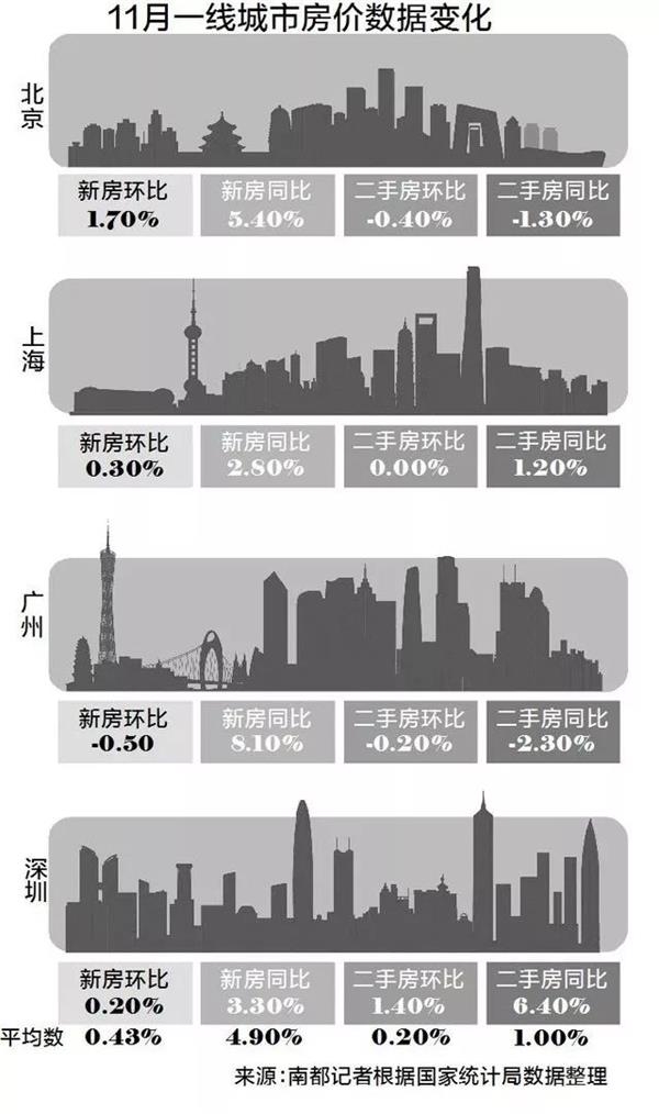 国家统计局近日公布的全国11月房价统计数据显示,深圳二手房价格11月环比上涨1.4%,而向来与深圳一起居于一线位置的北上广,它们的二手房价格环比却是两个下降,一个持平。