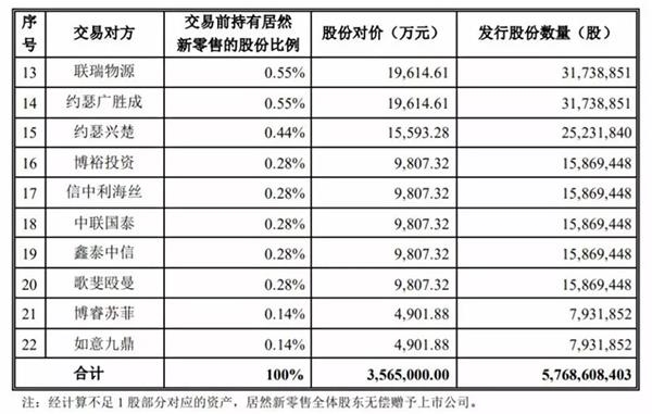 这一次借壳的具体交易中,武汉中商发行股份购买居然新零售100%的股权,交易作价356.5亿元,交易完成后,居然控股将直接持有上市公司42.60%的股份,并通过其全资子公司慧鑫达建材间接持有12.70%股份,成为上市公司的控股股东,同时,上市公司实控人由武汉国资委变更为汪林朋。