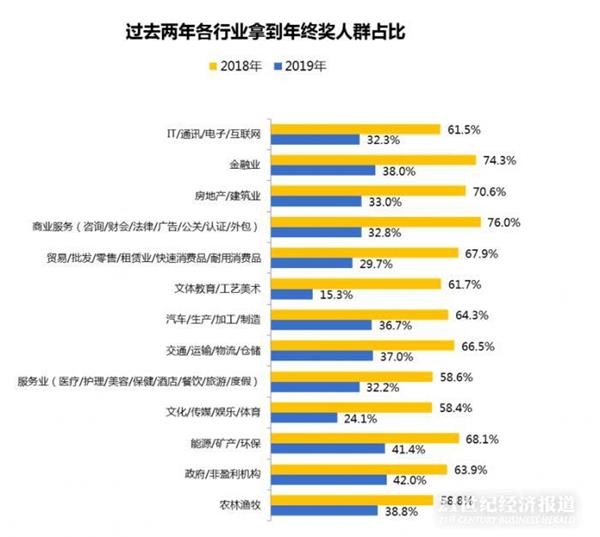 值得注意的是,2018年白领获得年终奖比例最高的商业服务行业今年这一占比也大幅下降,从76.0%跌至32.8%,下降了43.2个百分点。