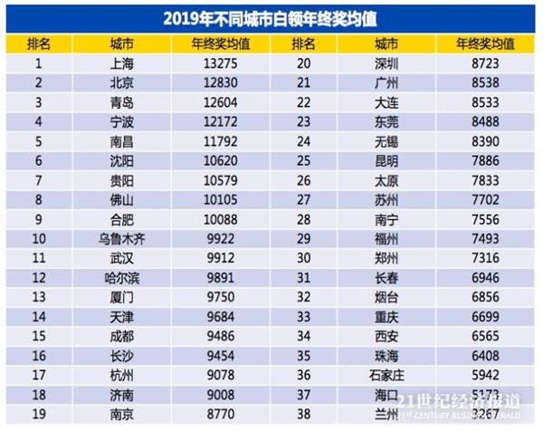 2019年度年终奖发放最高的城市是上海,上海白领的年终奖平均金额达13275元,包括上海在内,一共有9城市年终奖平均金额过万,其余8个城市分别是:北京(12830元)、青岛(12604元)、宁波(12172元)、南昌(11792元)、沈阳(10620元)、贵阳(10579元)、佛山(10105元)、合肥(10088元),而年终奖平均金额最低的城市是兰州,平均金额仅为3267元,上海白领的年终奖平均金额超过兰州白领的4倍。