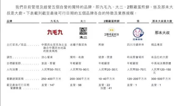 目前九毛九国际旗下有五个品牌,分别是主打西北菜的九毛九、太二酸菜鱼、2颗鸡蛋煎饼、四川冷锅串串“怂”和精品粤菜“那未大叔是大厨”。打开九毛九的招股书,简直就是一本美食满满的菜单。
