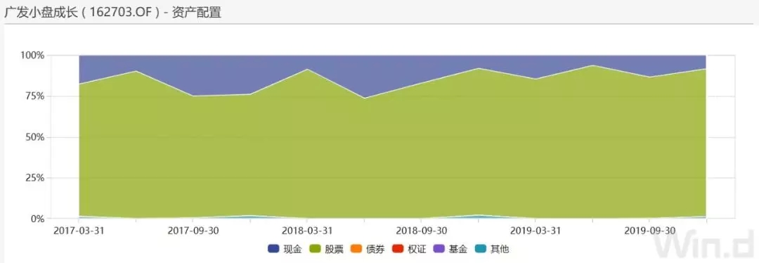 根据基金公告,广发小盘成长混合的资产配置区间为:股票资产配置比例为60%-95%,债券资产配置比例为0%-15%,现金大于等于5%。从2017年以来的股票仓位看,刘格菘在管理广发小盘成长混合基金时(从2017年6月19日开始管理),体现出一定的择时。比如,2018年下半年股票仓位持续提高,从2018年6月底的73.55%提高到2018年底的89.65%,在2019年一季度末又小幅下降至85.18%。