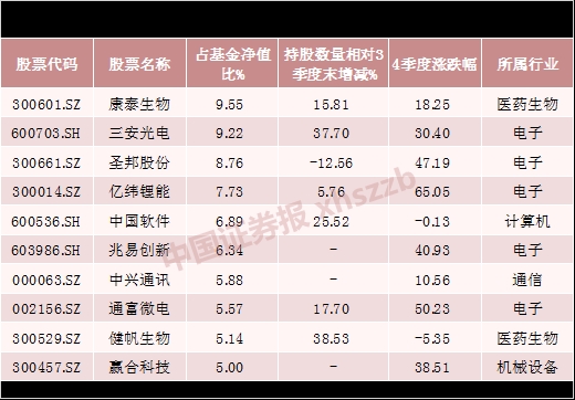在股票仓位整体提升和持股集中度继续提高的情况下,广发小盘成长混合在2019年四季度份额增长3.17亿份,就持股数量而言,刘格菘在这期间减持了一定的圣邦股份。大幅增持了康泰生物、中国软件、通富微电,对三安光电、健帆生物的持股量较2019年三季度末增长幅度超35%,同时兆易创新、中兴通讯、赢合科技新进前十大重仓股。