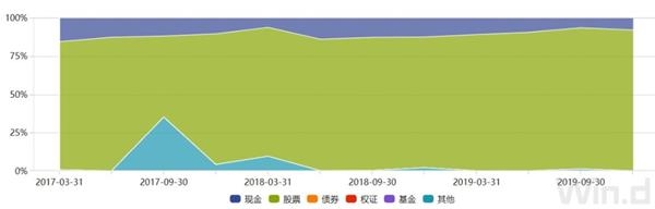 根据基金公告,东方红睿丰灵活配置混合基金的业绩比较基准为:沪深300指数收益率*70%+中国债券总指数收益率*30%,可见,该基金也是属于股票仓位偏大的混合型基金。从2017年以来的股票仓位看,林鹏管理这只基金时(从2017年4月12日开始管理),2018年6月以来一直保持着较高的股票仓位,股票仓位未低于85%。2019年四季度,其股票仓位变化不大,从三季度的91.98%调整至91.81%。