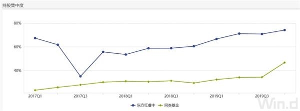从2017年以来的持股集中度看,林鹏管理的这只基金前十大重仓股占比基本上高于同类基金,在2018年一季度之后基本维持了超过60%的持股集中度,并且整体稳步上升。截至2019年底,其前十大重仓股占比74.11%,较2019年三季度的70.78%有所提高。
