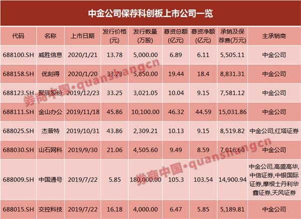 即便是曾经发生保代篡改科创板招股书招罚的奇葩案例,但这并没有阻挡中金公司在科创板市场上的风生水起。在优刻得成功上市后,1月21日威胜信息也将正式迎来上市敲锣,中金公司保荐承销的科创板将多达8家,承销保荐费用超过7亿元,数量遥遥领先。