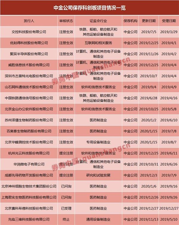目前来看,在科创板受理的206家公司中,中金公司保荐项目多达18家。其中,已有11家注册生效,3家提交注册,3家已问询/受理,仅有先临三维一家终止,整体成功率较高。