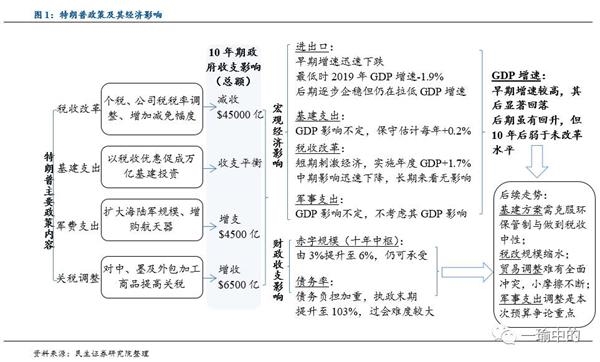 就各单项政策而言,税改政策带来的债务压力最大,由而调整的可能性较大,减税幅度将会缩减;基建政策作为执政重点可能很快会被推出;军事支出受到了军方支持;全面贸易冲突难现但政策摩擦不断。