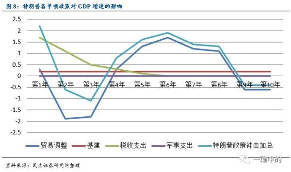 各单项政策中,贸易调整对GDP增速影响最大,税收支出有短期影响,基建影响较小但保持持续性,军事支出效果不明。