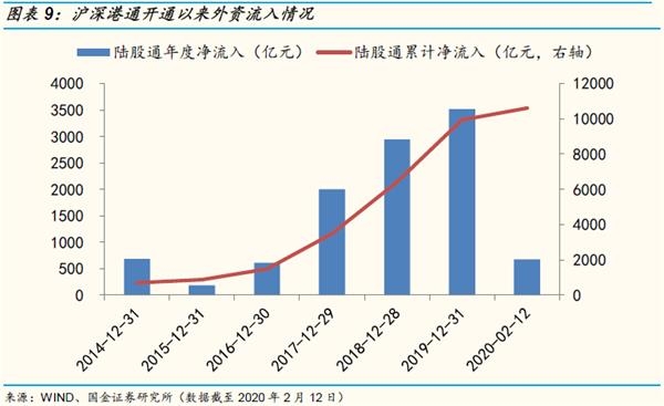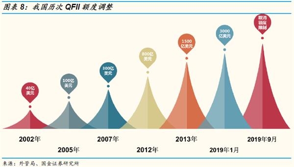随着A股未来进一步纳入各国际指数,同时对外开放持续推进,A股国际化程度将不断提高,外资流入A股长期趋势不变。根据国际指数纳入安排,A股纳入各大国际指数将在长期内持续落实,逐步实现100%纳入。同时,我国对外开放持续推进,自2002年实施QFII制度以来,QFII额度已从最初的40亿美元提高至2019年初的3000亿美元,并在2019年9月10日宣布全面取消合格境外投资者投资额度限制。相较2019年,虽然A股纳入国际指数事件减少,但A股国际化将逐步推进,而当前外资对A股配置比例仍低,A股中外资占比仅3.27%,未来外资将持续配置A股,外资长期流入趋势不变。