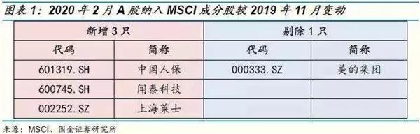 国金证券指出,此次调整,本次A股纳入MSCI成分股的变化:与2019年11月公告名单相比,本次A股纳入MSCI全球指数体系的成分股新增3只:中国人保、闻泰科技、上海莱士;剔除1只:美的集团。