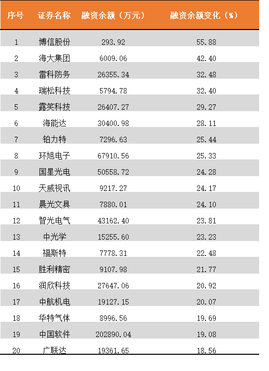 融资余额增幅最大的是博信股份,该股最新融资余额293.92万元,较前一交易日增长55.88%。另外,融资余额增幅较大的还有海大集团、雷科防务等,增幅分别达42.40%、32.48%。