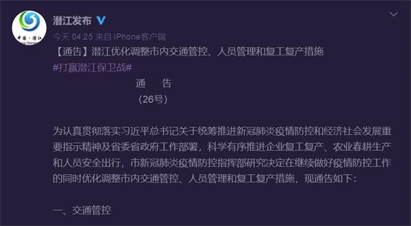 “潜江发布”称,这是湖北第一个决定全面恢复正常生产生活秩序的城市。