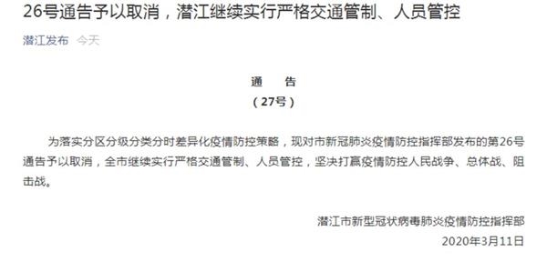然而,3月11日上午11点左右,潜江市新型冠状病毒肺炎疫情防控指挥部发布“27号通告”表示,对市新冠肺炎疫情防控指挥部发布的第26号通告予以取消,全市继续实行严格交通管制、人员管控。