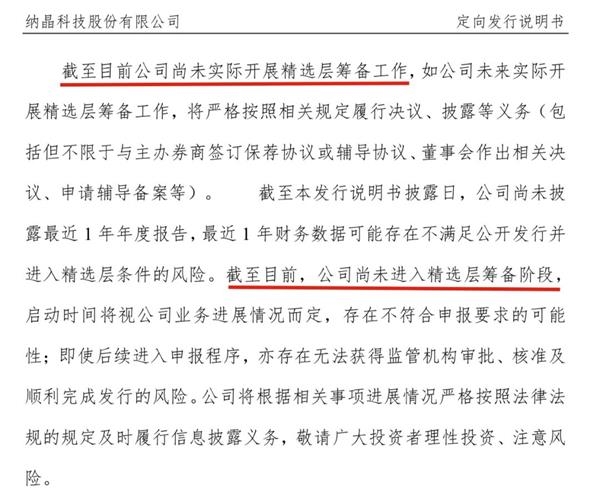 3月13日纳晶科技在修订过的《股票定向发行说明书》中表示,公司尚未实际开展精选层筹备工作。