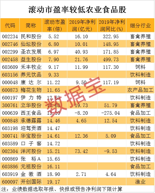 在多方面因素刺激下,食品饮料和农林牧渔板块近期表现相对抗跌。从目前的数据来看,这两大板块整体涨幅跑赢大盘指数。在这两大行业中,截至昨日收盘,有20股滚动市盈率不足20倍,分别是民和股份、仙坛股份、圣农发展、益生股份、禾丰牧业等。民和股份市盈率最低,为5.52倍。民和股份是国内鸡产业链龙头公司,业绩快报显示,去年净利润为16.1元,同比增长322.95%。