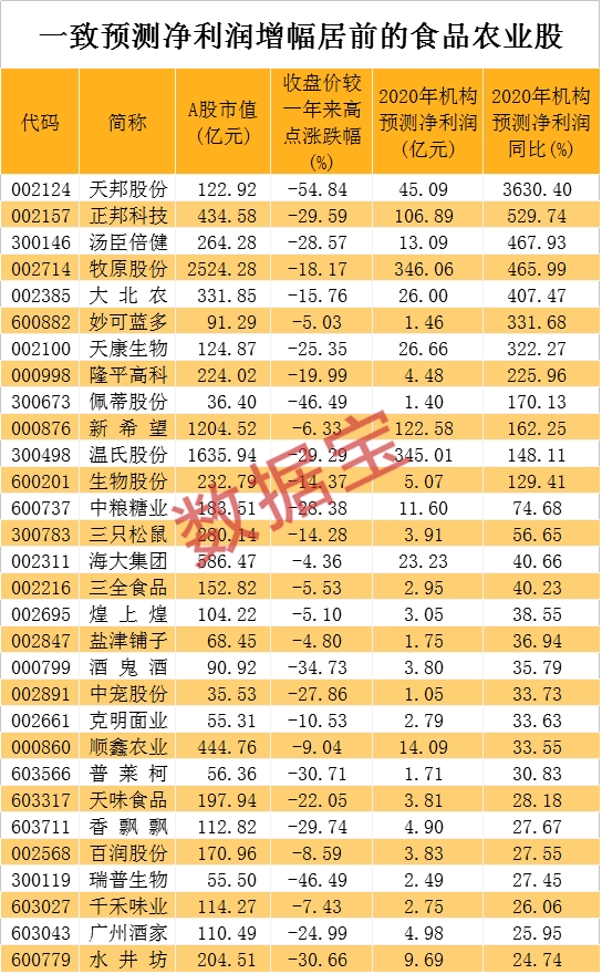 根据5家以上机构一致预测数据,在上述两大行业中,50股今年净利润有望同比增长10%以上。一致预测净利润增幅最高的是天邦股份,机构一致预测其净利润为45.09亿元,同比增长36.3倍。该股今日早盘涨停,不过与其近一年高点相比,回调幅度依然在50%以上。机构预测净利润增幅居前的还有正邦科技、汤臣倍健、牧原股份、大北农、妙可蓝多等。