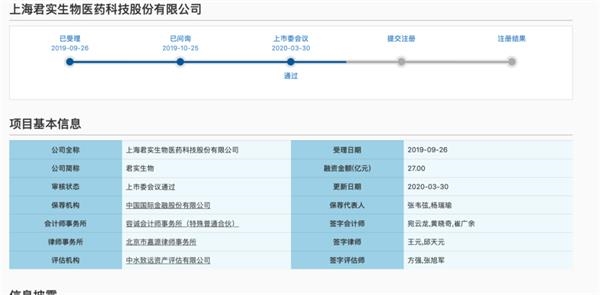 3月30日科创板上市委发布2020年第7次审议会议结果公告,同意上海君实生物医药科技股份有限公司发行上市。