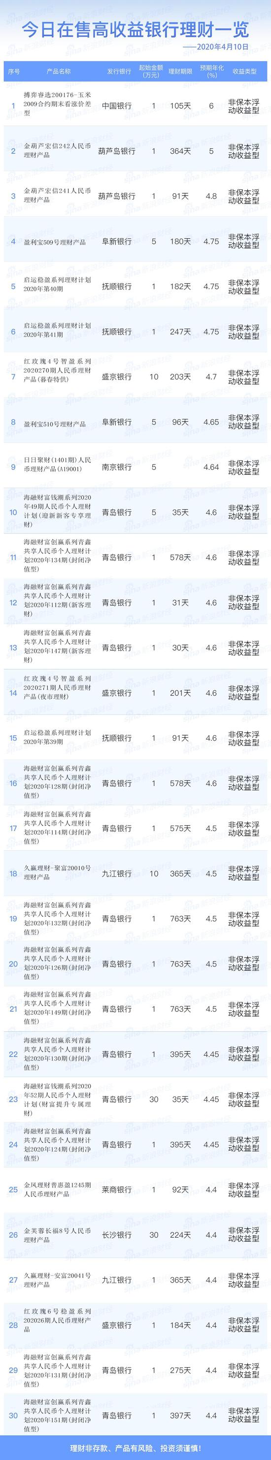 4月10日在售高收益银行理财产品:今日在4.8%以上的银行人民币理财产品共3款。中国银行(3.510, 0.02, 0.57%)的“搏弈睿选200176-玉米2009合约期末看涨价差型”预期年化收益率最高为6%。
